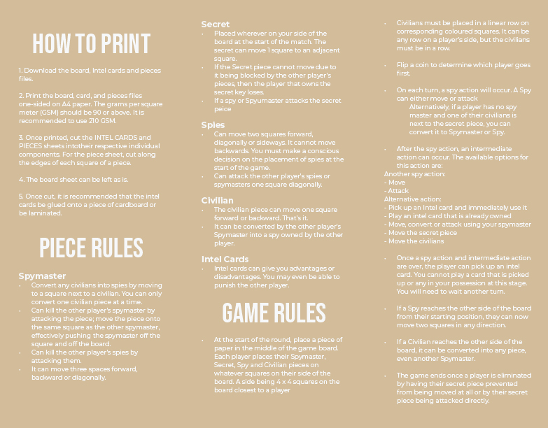 Spymasters is a game of area control and strategy, where two opponents aim to capture the other’s secret piece. Each player maneuvers spy pieces, civilian pieces and a spymaster piece on a chess-like board. Each turn consists of a player acting with their spies, followed by an intermediate action, such as playing an intel card. Lastly, a player draws an intel card. These intel cards provide buffs and debuffs, providing an element of surprise to the game.